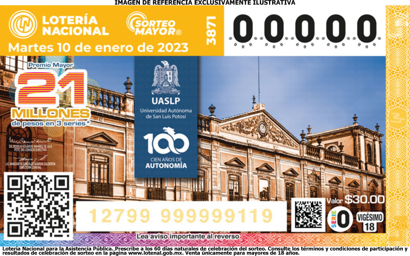 La Universidad Autónoma del Estado de San Luis Potosí está llegando a su centenario, y en Lotería Nacional lo conmemoramos con el billete de Lotería del Sorteo Mayor no. 3871. La autonomía de la UASLP, obtenida en el año de 1923, fue consecuencia de un proceso de cambios ideológicos y de mentalidad de maestros, directivos, jóvenes estudiantes e integrantes del gobierno de aquella generación visionaria. Paulatinamente, como en todo proceso histórico, fue generándose una idea de cambio. El movimiento social y armado que implicó la Revolución Mexicana permeó profundamente el pensamiento de la generación de hombres y mujeres que se vieron envueltos en él. Es el caso de aquellos potosinos que consolidaron la autonomía de nuestra institución, en un hecho sin precedentes en el ámbito nacional. El nacimiento de la Universidad Autónoma de San Luis Potosí fue el resultado de pugnas ideológicas de hombres y mujeres que buscaron la libertad a través de la educación. Hoy conocemos la historia de los diversos movimientos que maestros y estudiantes llevaron a cabo a partir de los últimos 20 años del siglo XIX en pro del cambio en la estructura educativa de nivel superior. En marzo de 1885, un grupo de estudiantes del Instituto Científico y Literario, apoyados por diversos personajes de la cultura y la ciencia en San Luis Potosí, manifestaron abiertamente su deseo de cambio al interior del mismo Instituto, y fundaron una entidad, aunque por un breve periodo, que ellos mismos denominaron como “Universidad Libre”. Fueron los primeros intentos por obtener libertad de cátedra y de pensamiento para la institución.