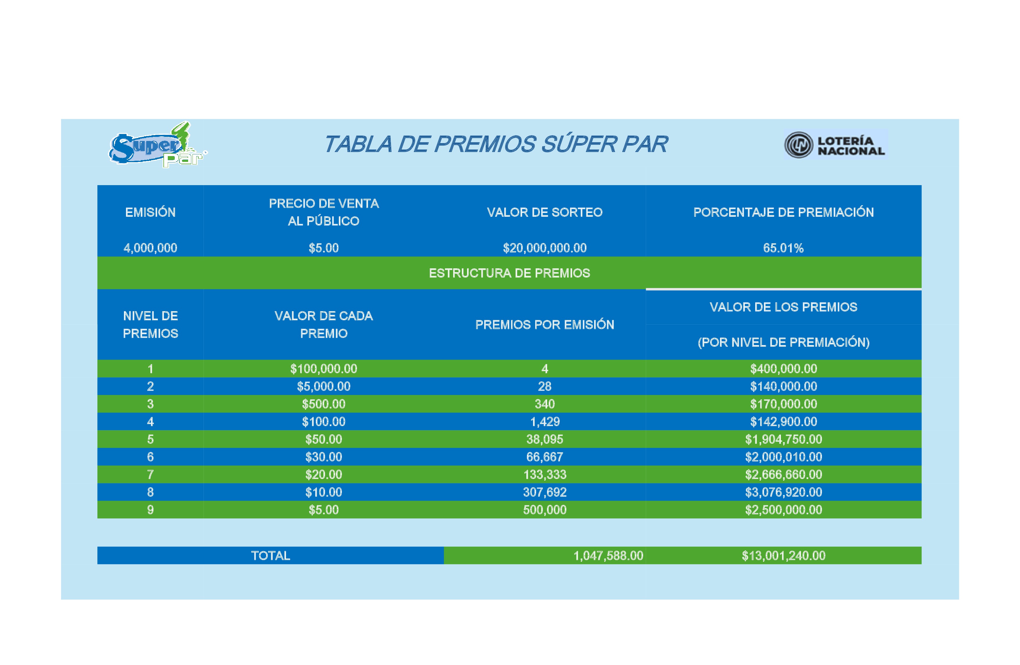 Los montos de los premios mostrados son generados aleatoriamente por el sistema de Súper Par y, por lo tanto, pueden variar. Para conocer los montos de los premios en su totalidad, consulta la tabla de premiación.